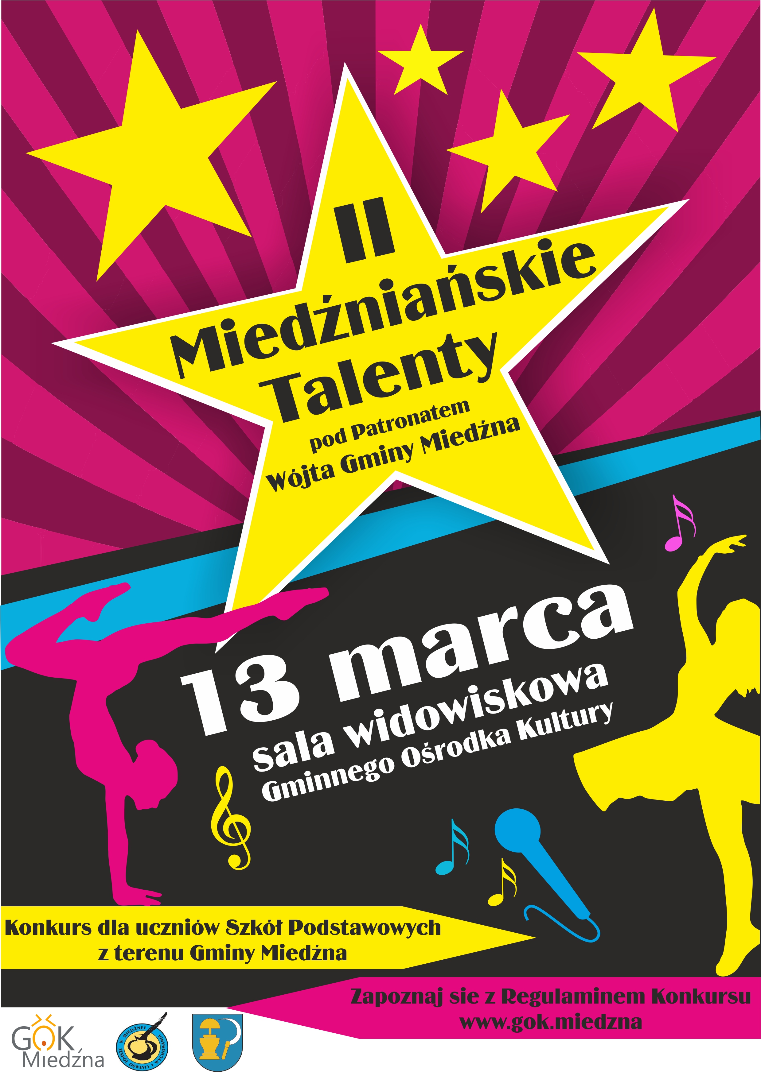 Gminny Ośrodek Kultury w Miedźnej z siedzibą w Woli oraz Zespół Oświaty i Wychowania w Miedźnej z siedzibą w Woli zapraszają do udziału w konkursie Miedźniańskie Talenty` 2024 pod patronatem Wójta Gminy Miedźna, który odbędzie się 13 marca w sali Gminnego Ośrodka Kultury w Woli.