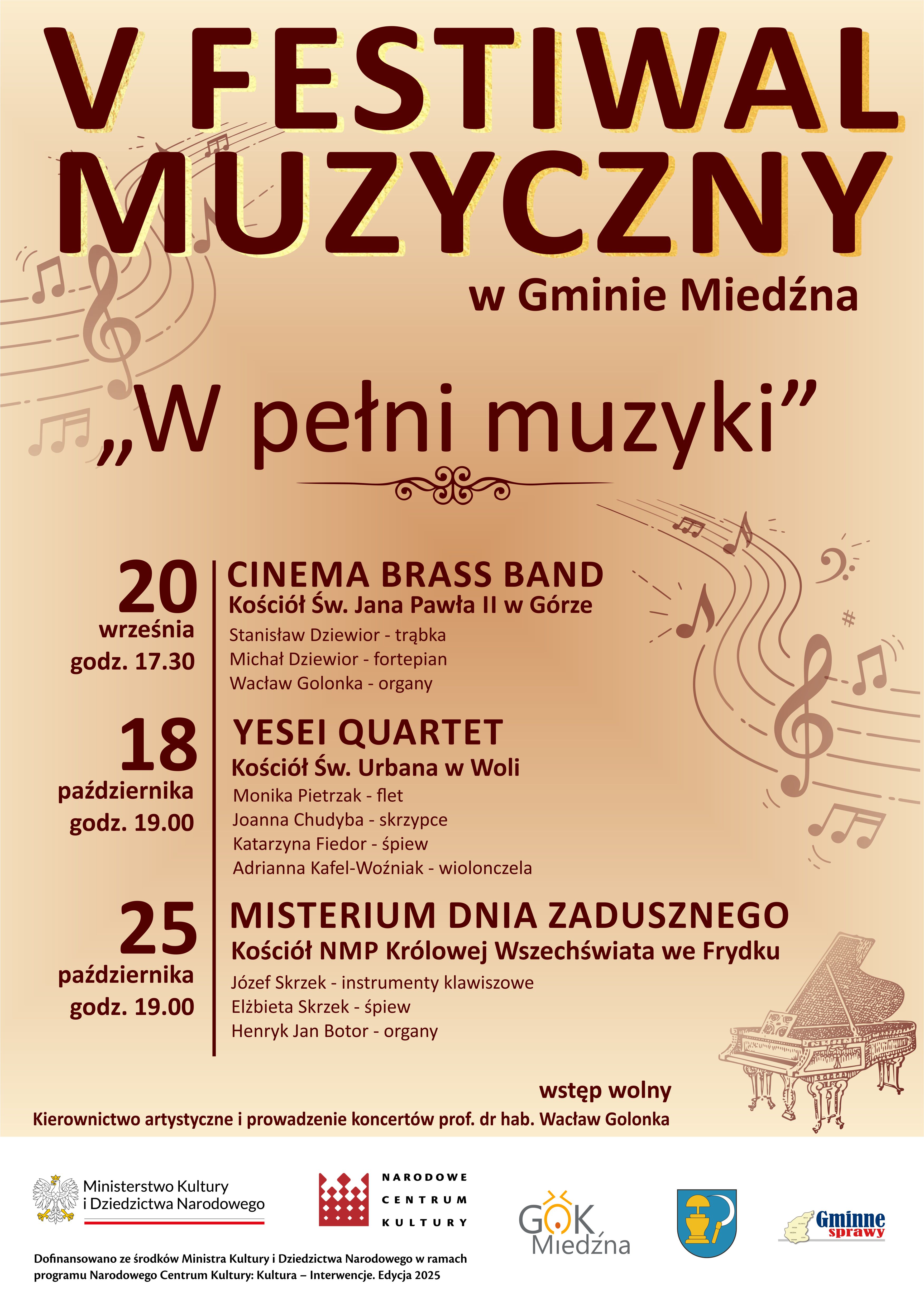 „ W pełni muzyki” Pod takim tytułem odbędzie się tegoroczna edycja Festiwalu Muzycznego w Gminie Miedźna. Celem jest pokazanie wielu stylów muzycznych w tym muzyki filmowej, klasycznej, folkowej. Takie bogactwo muzyki ukaże jej pełnię, a co ważniejsze słuchacze otrzymają szeroką paletę różnorodności artystycznej i emocjonalnej. Dzięki temu publiczność będzie miała możliwość wyjątkowych przeżyć w pełni muzyki.Wystąpią też bardzo ciekawi artyści z różnych stron sceny muzycznej zapewniający bardzo wysoki poziom festiwalu. Począwszy od artystów związanych z NOSPR, przez nietuzinkowy kwartet żeński, aż po jedną z najwyrazistszych osobowości muzyki rockowej Józefa Skrzeka. Wystąpi on z wybitnym polskim organistą Henrykiem Botorem oraz swoją córką Elżbietą w autorskim programie. Festiwal poprowadzi prof. dr hab. Wacław Golonka, sprawując kierownictwo artystyczne wydarzenia.